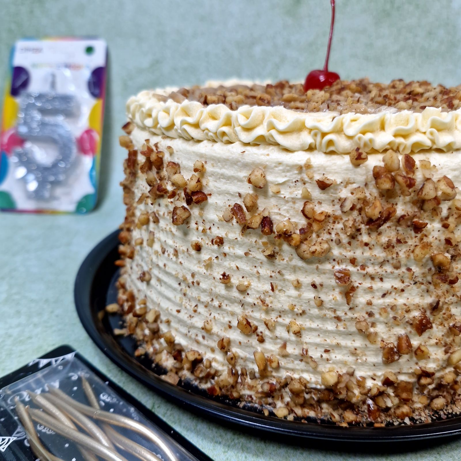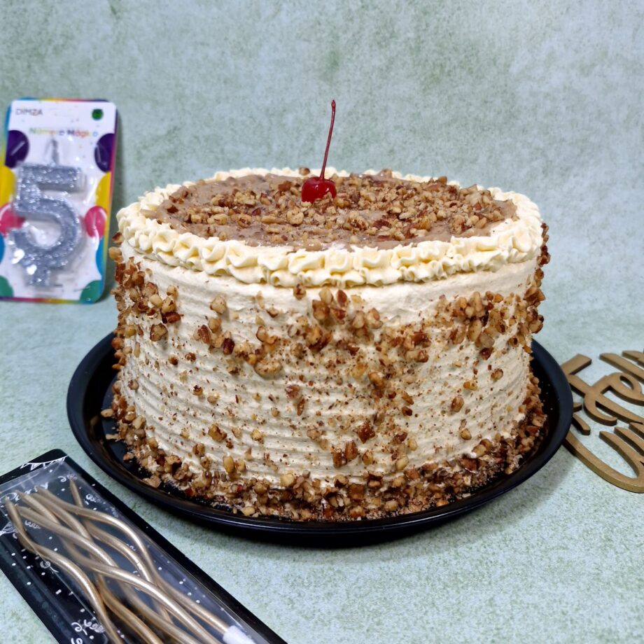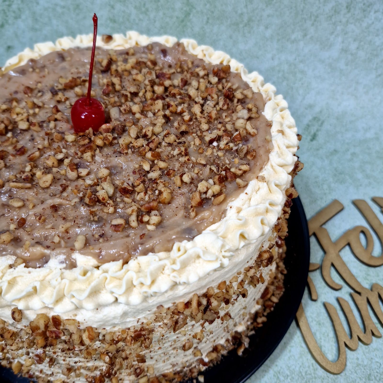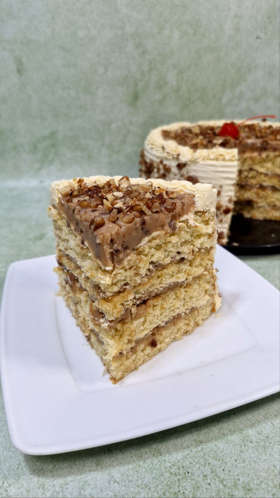 Pan vainilla con relleno cajeta coco y nuez cubierto betún chantilly