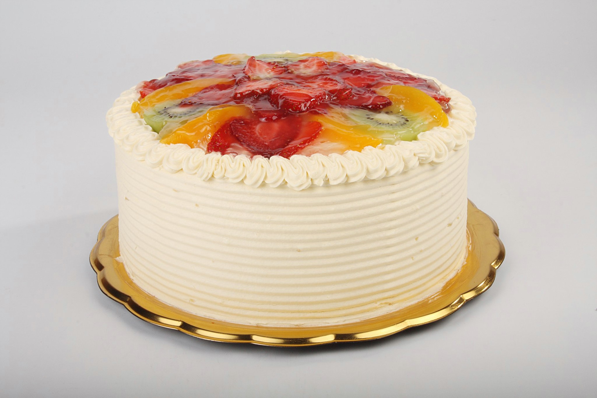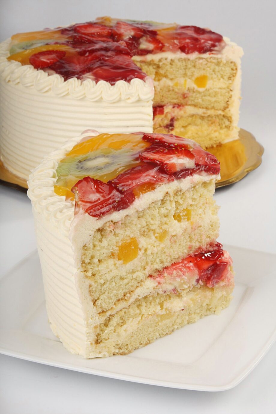 Pan vainilla relleno y cubierto con fresa, piña, durazno y kiwi