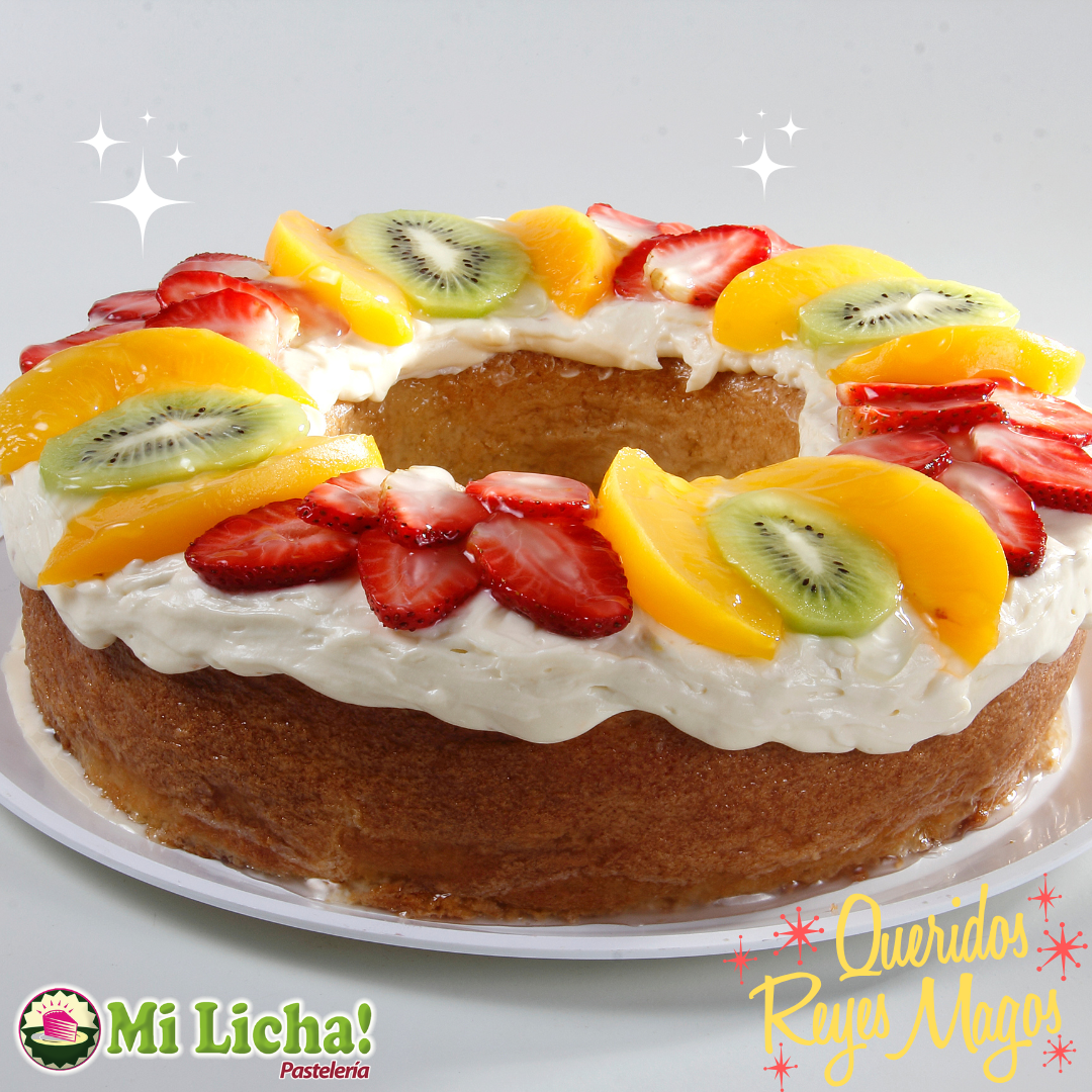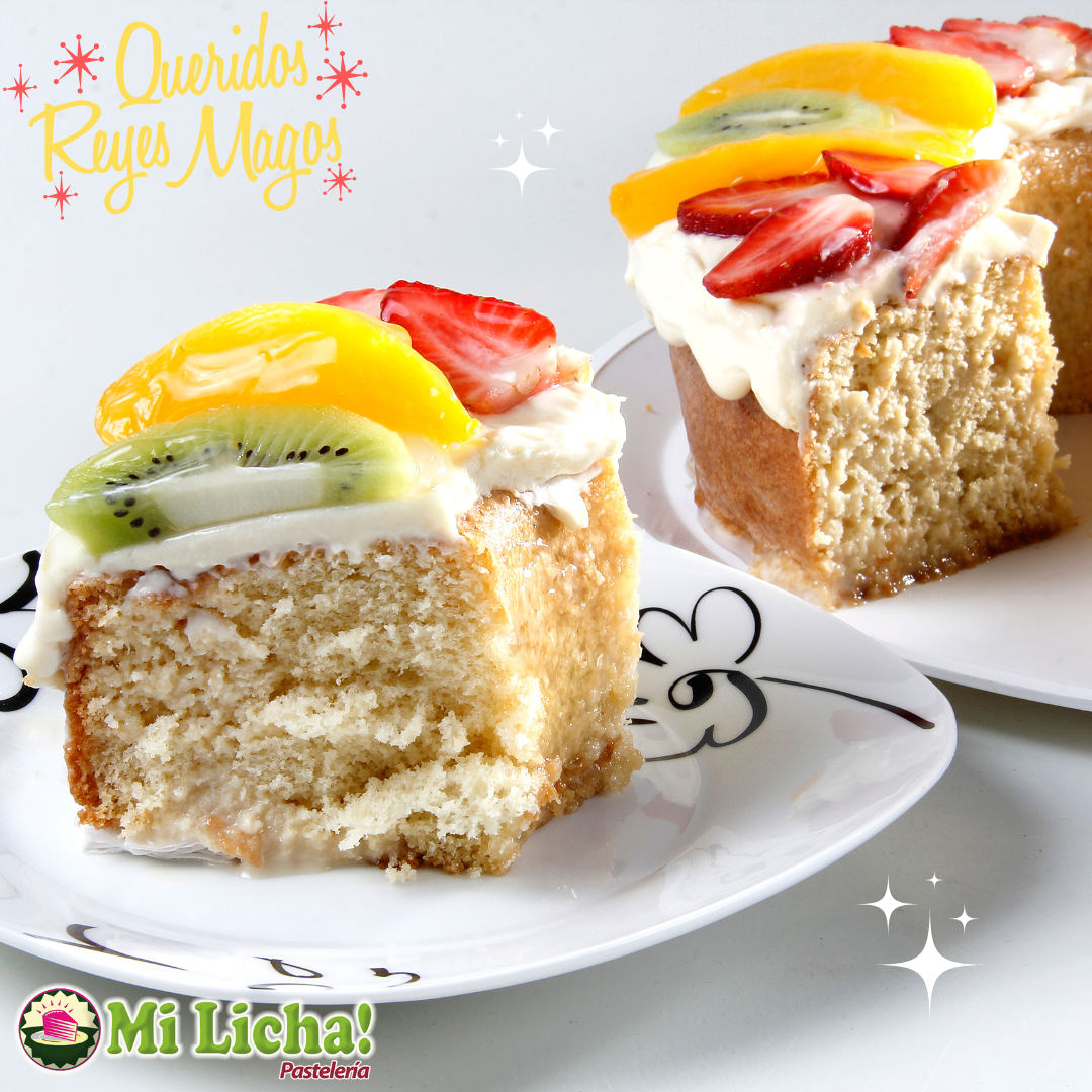 Pan vainilla humedecido en tres leches con betún de queso philadelphia y fruta.